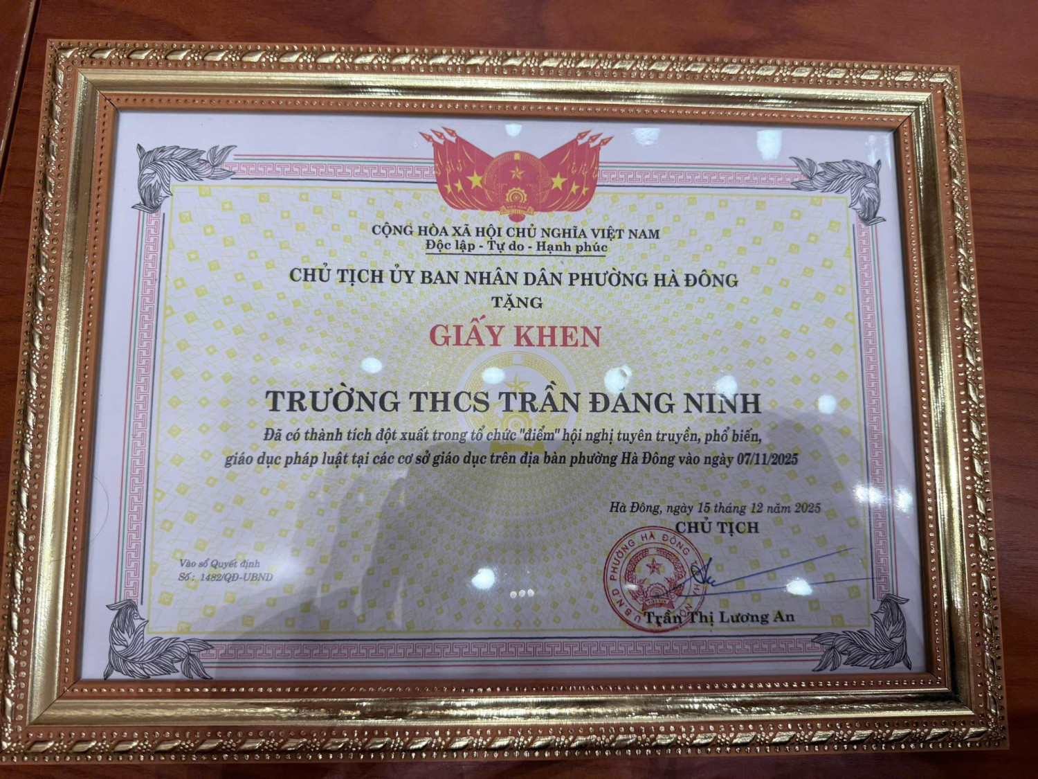 THCS TRẦN ĐĂNG NINH VINH DỰ NHẬN GIẤY KHEN TẠI HỘI NGHỊ TỔNG KẾT CÔNG TÁC CÔNG AN PHƯỜNG HÀ ĐÔNG NĂM 2025